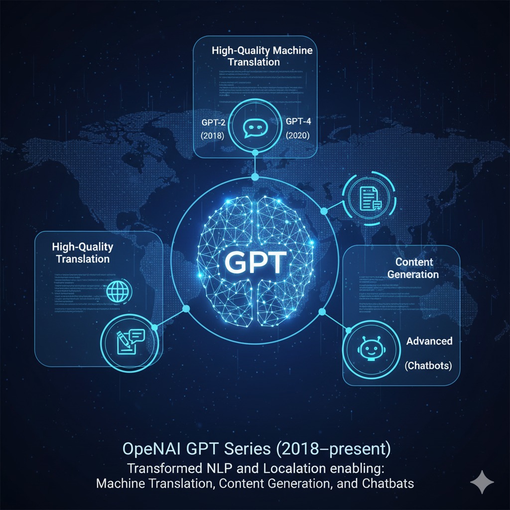 GPT-2, GPT-3, and GPT-4 transformed NLP and localization by enabling high-quality machine translation, content generation, and chatbots.